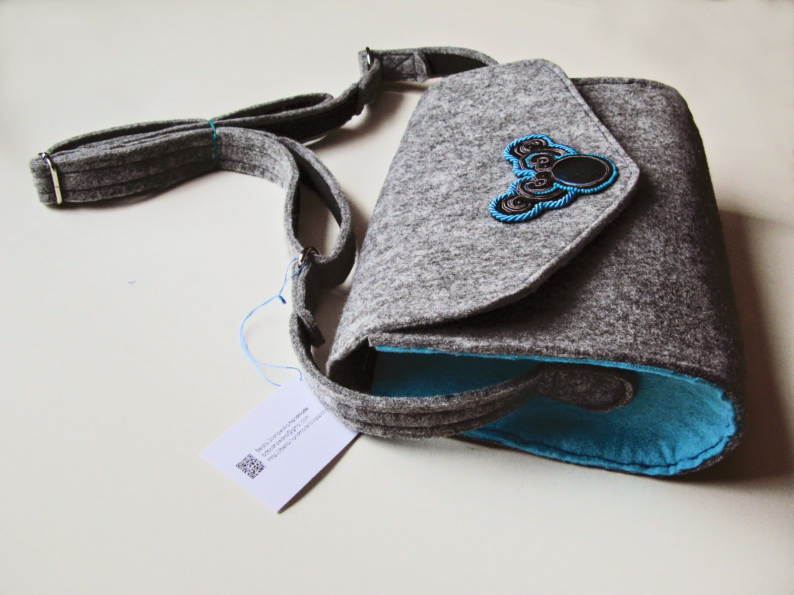 Kolejny świąteczny prezent na zamówienie od Joanny dla Izy. Pierwsza taka, ale chyba wzbudziła zainteresowanie i będą powstawały nowe. Wykonana z filcu, a ozdobiona została sutaszem. Długi, regulowany pasek. W środku podwójna kieszonka na drobiazgi (jedna na zamek). Jedyna i niepowtarzalna!